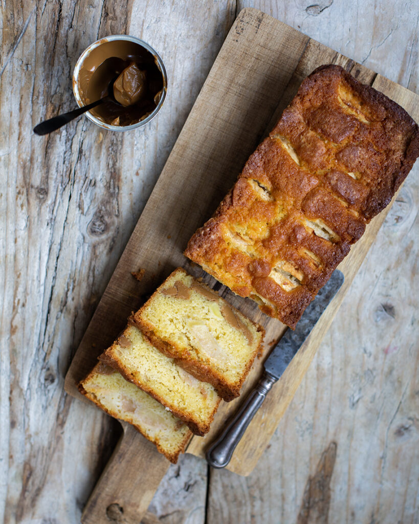 Vet een bakvorm in met flink wat boter en bestrooi met bloem. Doe het beslag in de cakevorm. Schil intussen de appels in partjes en duw ze 1 voor 1 in het beslag.